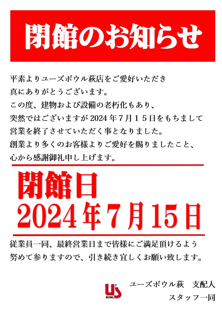 ユーズボウル萩店、お別れボウリング大会参加者募集中!!