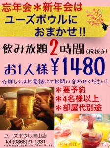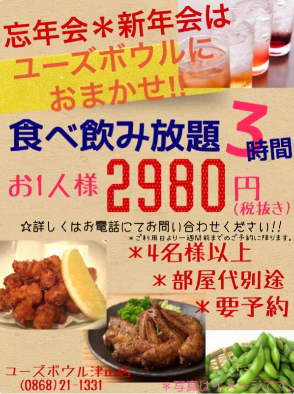 ユーズボウル津山店では、忘年会・新年会にピッタリの食べ・飲み放題を