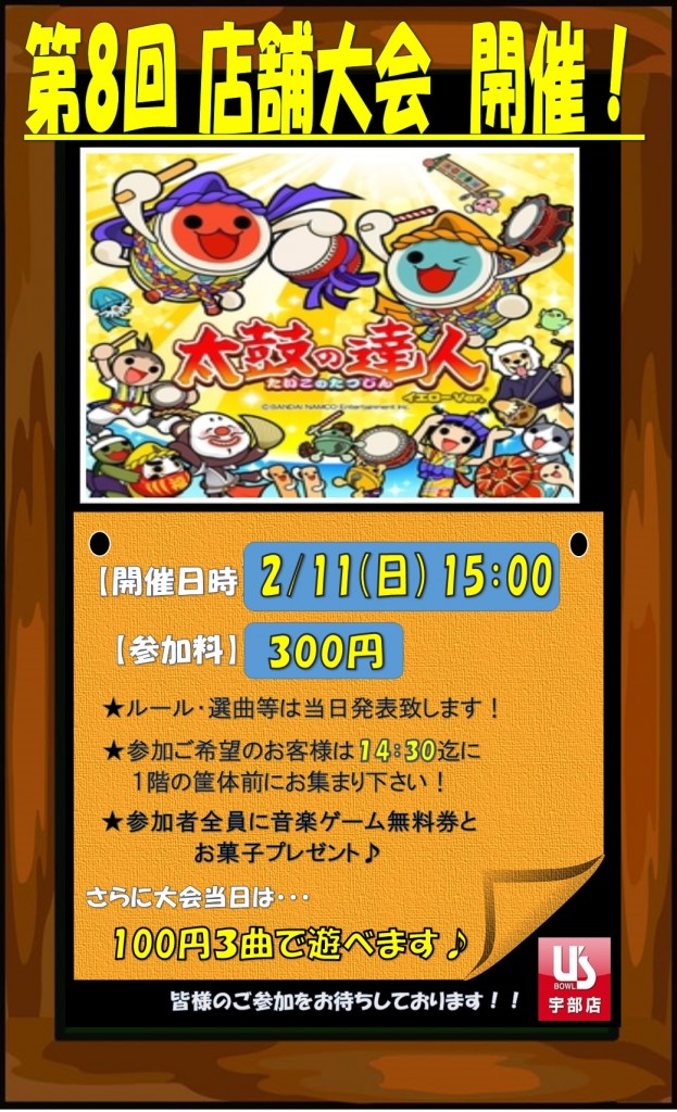 2/11(日・祝) 15:00より第8回 新・太鼓の達人 店舗大会を開催致します! 大会ルールや選曲は当日発表とさせていただきます。 参加ご希望のお客様は当日14:30までに1Fゲームコーナーの本筐体前にお集まり下さい。 優勝賞品は豪華景品をプレゼント♪ 参加されたお客様全員に音楽ゲームが1回無料で遊べるサービス券とお菓子をプレゼント致します!! さらに当日にかぎり、終日100円3曲でお得に遊べますよ!! スペシャルグッズプレゼントキャンペーンも開催中です!! みなさんのご参加をスタッフ一同、お待ちしております。